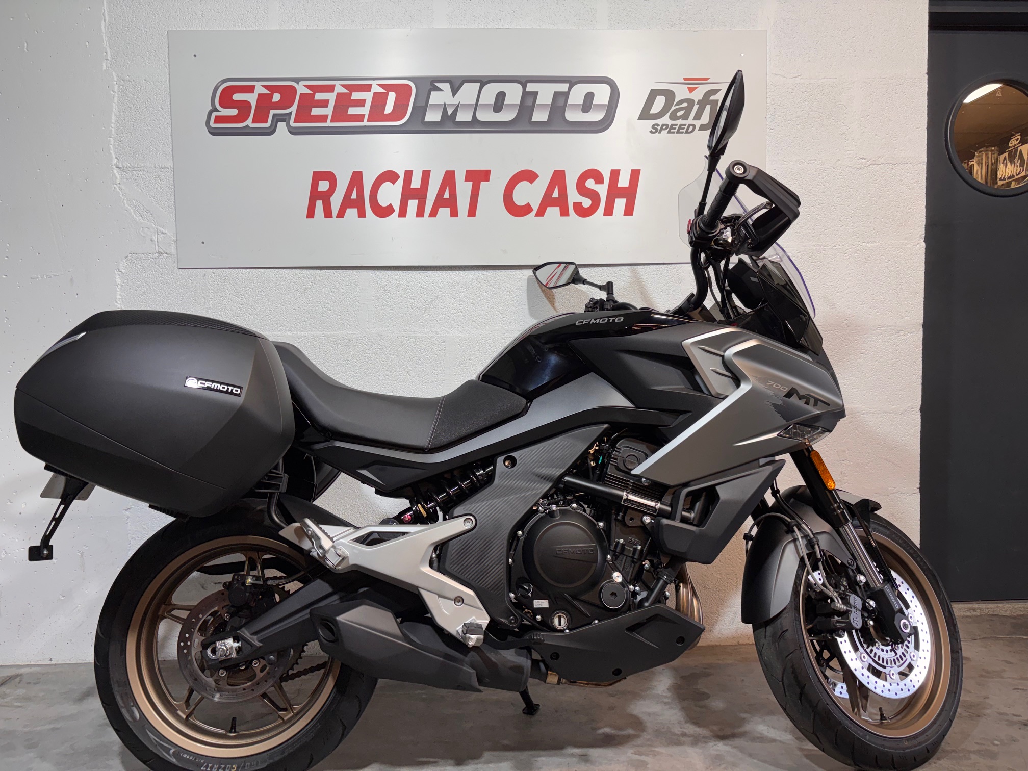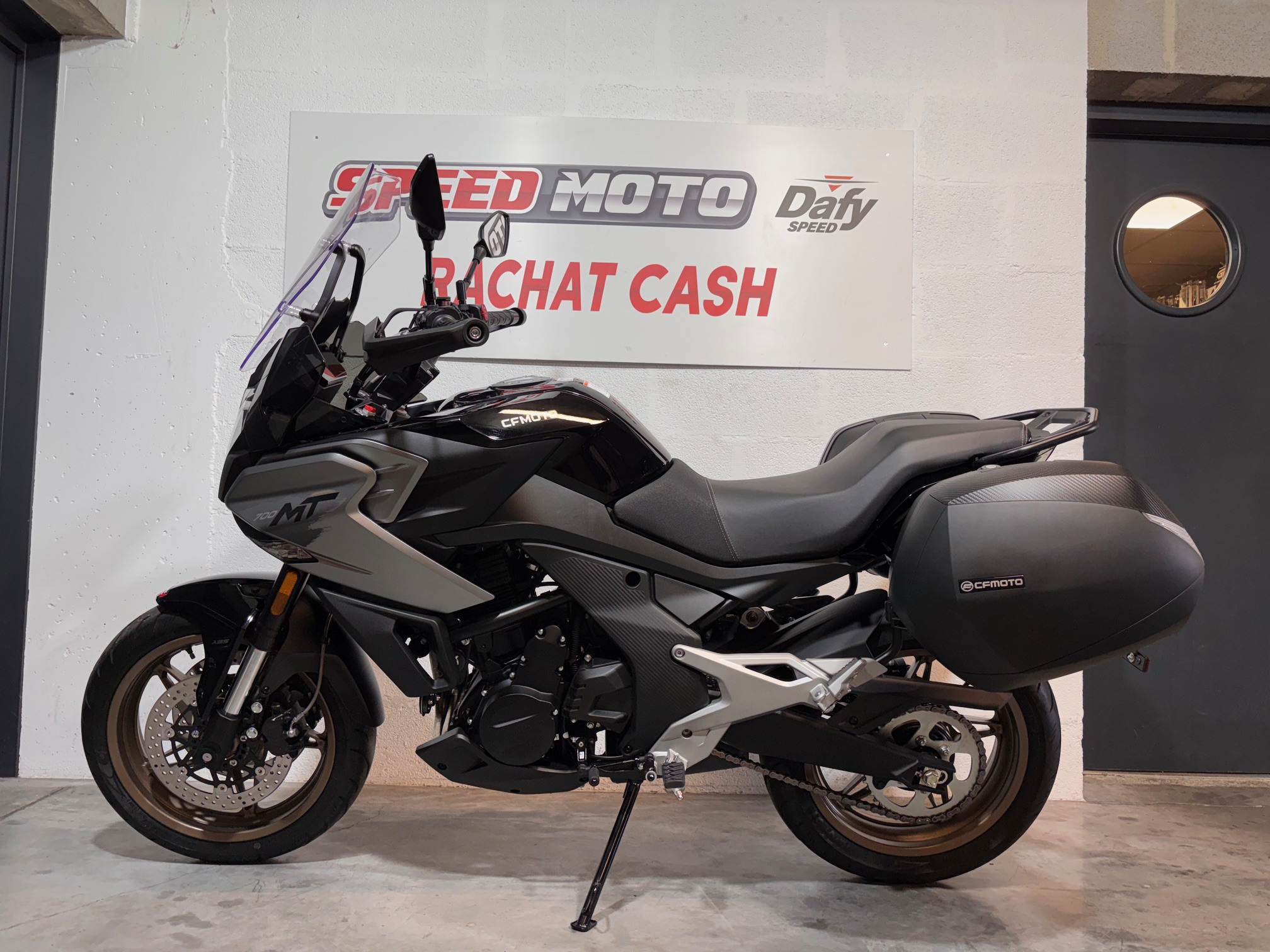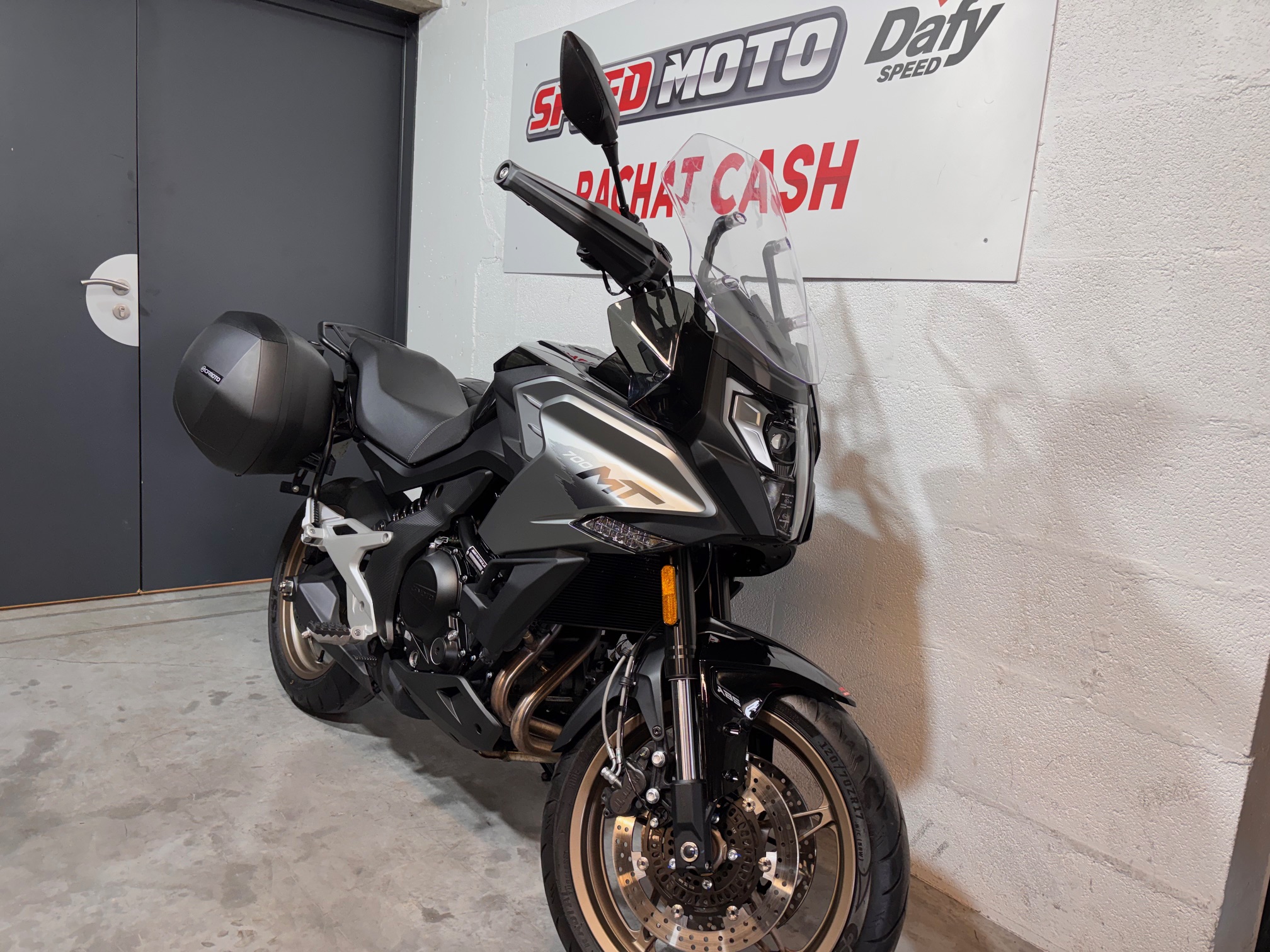 CFMOTO 700 MT d’occasion dans un état proche du neuf. Vendue avec 2 valises latérales SHAD. Véhicule entretenue dans notre établissement, garantie constructeur 5 ans encore valide jusqu’en 2029. Facture entretien en notre possession.
